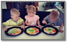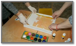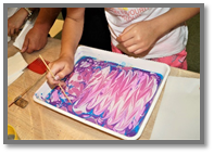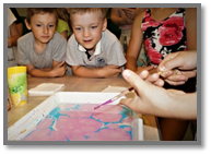 Приготовьте раствор воды с загустителем, вылейте его в поддон (лоток). Разлейте краски различных цветов в баночки. Приготовьте дополнительные инструменты (кисточки и шило).
