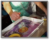 После того, как будет готов фон, приступайте к нанесению основного рисунка. Для начинающих мастеров предлагается выполнить несложный рисунок цветка. Для этого обмакните шило в краску и легонько коснитесь поверхности воды, не опуская кончик слишком глубоко. У вас должен получиться небольшой кружок. Если хотите картинку большего размера, то несколько раз коснитесь шилом или палочкой с краской ещё раз в ту же точку. Затем поверх предыдущей капли сделайте аналогичное пятно, но другим цветом. В дальнейшем, касаясь краев внешнего круга, тяните шило вовнутрь, разрезая круг на равные части.