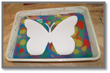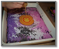 Совет: количество слоёв краски зависит от размера лотка, чем меньше поверхность поддона, тем меньшее количество слоёв краски можно нанести на поверхность воды (это касается фона). Нанесённые капельки растяните с помощью шила (палочки) или гребня, придавая фону необычный орнамент.