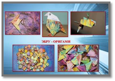 Поделки, изготовленные детьми способом оригами на расписанной бумаге в технике Эбру, применяются в качестве персонажей для проведения речевых зарядок, в театрализованной деятельности.