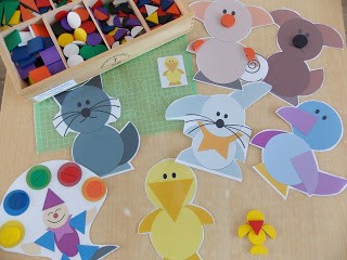 Ребёнок, из имеющихся геометрических фигур, должен подобрать к образцу подходящие по цвету и размеру фигуры, и попытаться сложить самостоятельно предмет или животное.