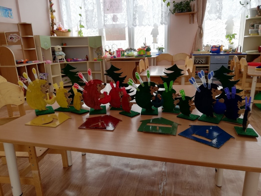 Состав игры: игра состоит из 4-х комплектов ёжиков: красного, желтого, синего и зеленого цветов. В каждом комплекте ёжики трех размеров: маленький, средний, большой. К каждому ёжику идет подставка – трава, вместо иголок прищепки, соответствующие цвету и размеру ёжика. Еще в комплекте имеется корзинка соответствующего цвета и грибочки по количеству ёжиков (три). Домики с окошками в виде геометрической фигуры (круг, треугольник, квадрат, прямоугольник). Так же в комплект входят ёлочки с подставкой – травой.