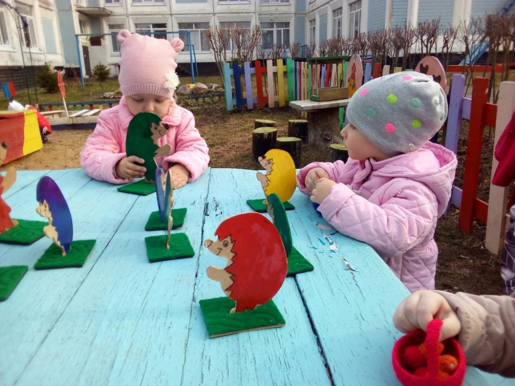 Игру можно дополнять. Например, Ёжики собрались в отпуск. Добираться решили на поезде. Каждой семье Ёжиков нужно занять вагон соответствующего цвета. Чтобы поезд поехал, нужно ко всем вагончикам прикрутить колеса и с помощью цветных шнурков прикрепить вагончики к поезду.
