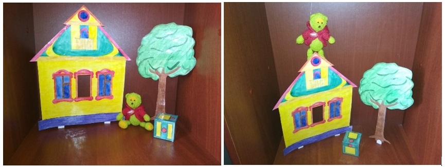 — Молодцы! Но Мишутка оказался такой шустрый, что спрыгнул с крыши. И где же он теперь? (Теперь наш мишка находится между домом и деревом)